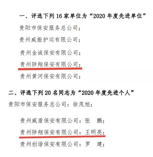 2021年的開(kāi)年之際,貴州陟翔保安有限公司迎來(lái)了一個(gè)喜訊,公司被貴陽(yáng)市保安協(xié)會(huì)授予2020年度“先進(jìn)單位”的榮譽(yù)稱號(hào)。同時(shí),公司員工王明亮被授予2020年度“先進(jìn)個(gè)人”榮譽(yù)稱號(hào)。